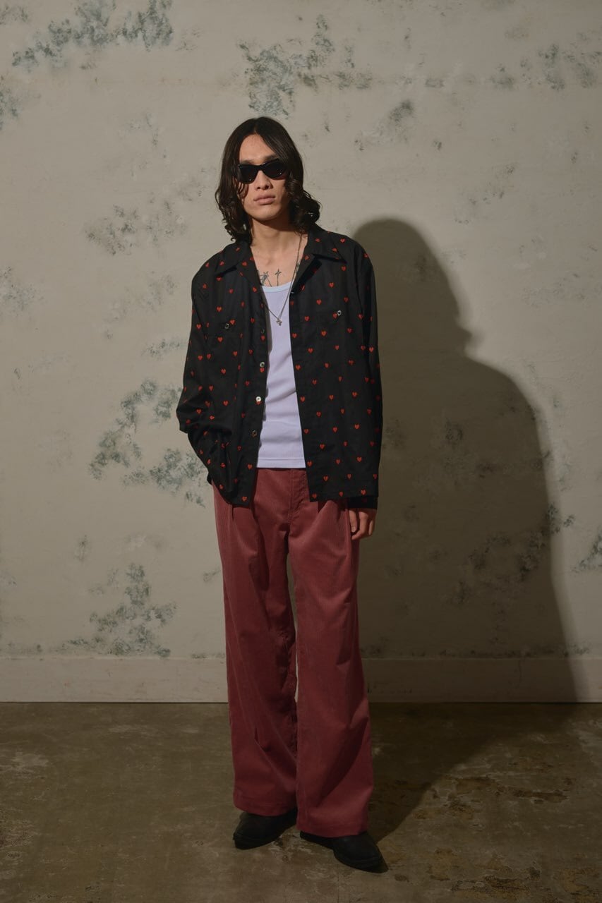ポップなハート柄を男臭さのあるワークシャツスタイルに落とし込み作成。