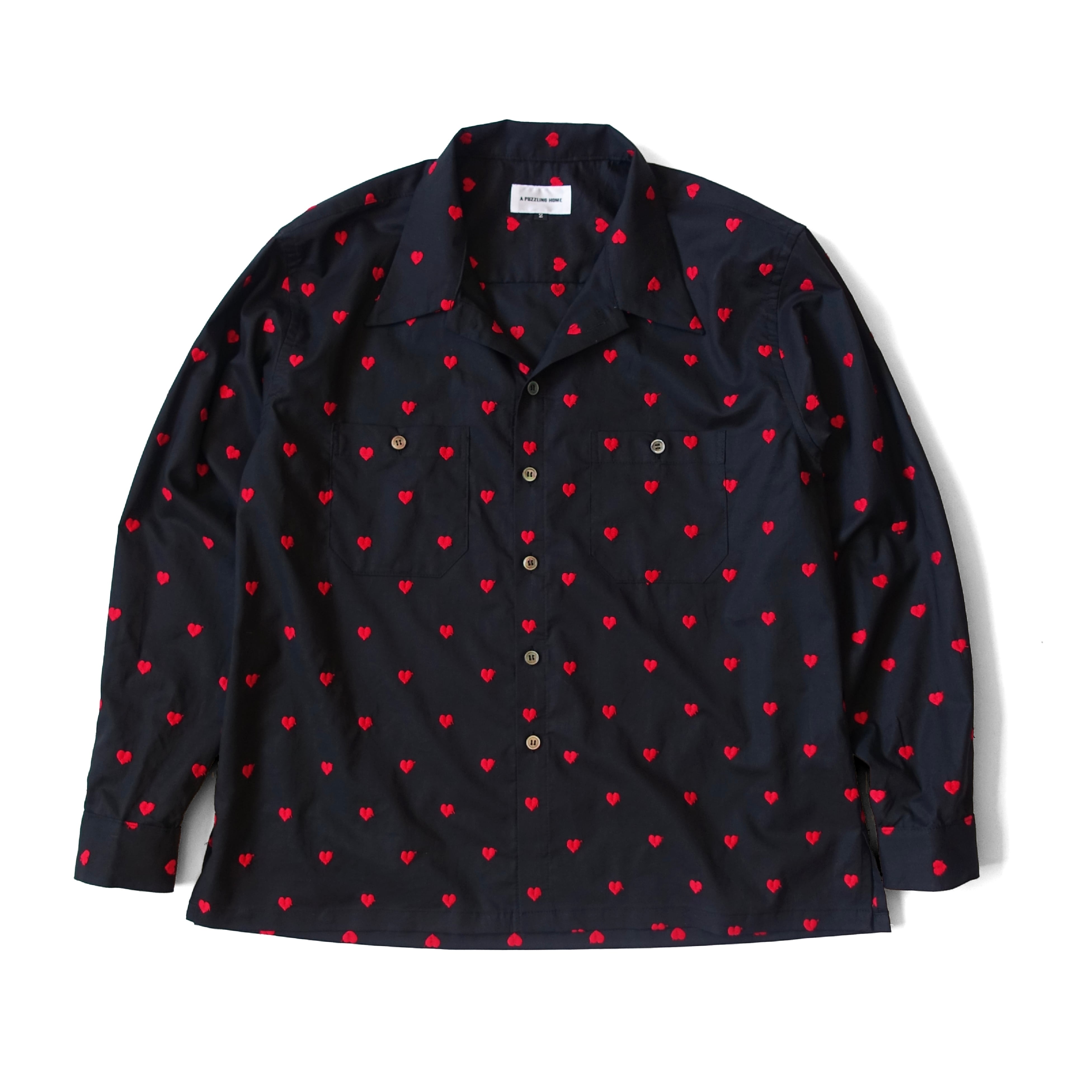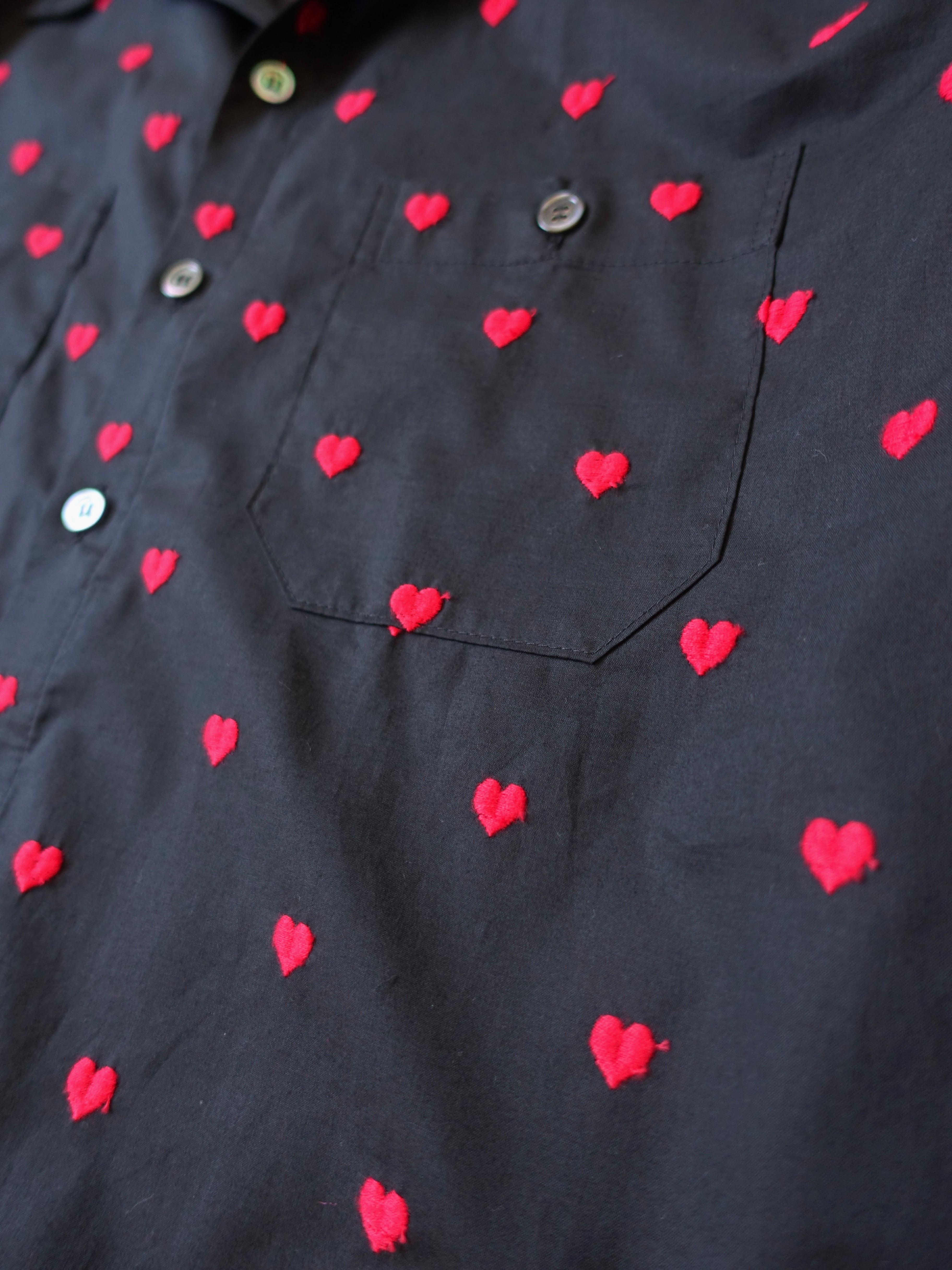 透け感のあるコットンローン生地に総柄でハート刺繍を施したオープンカラーシャツ。