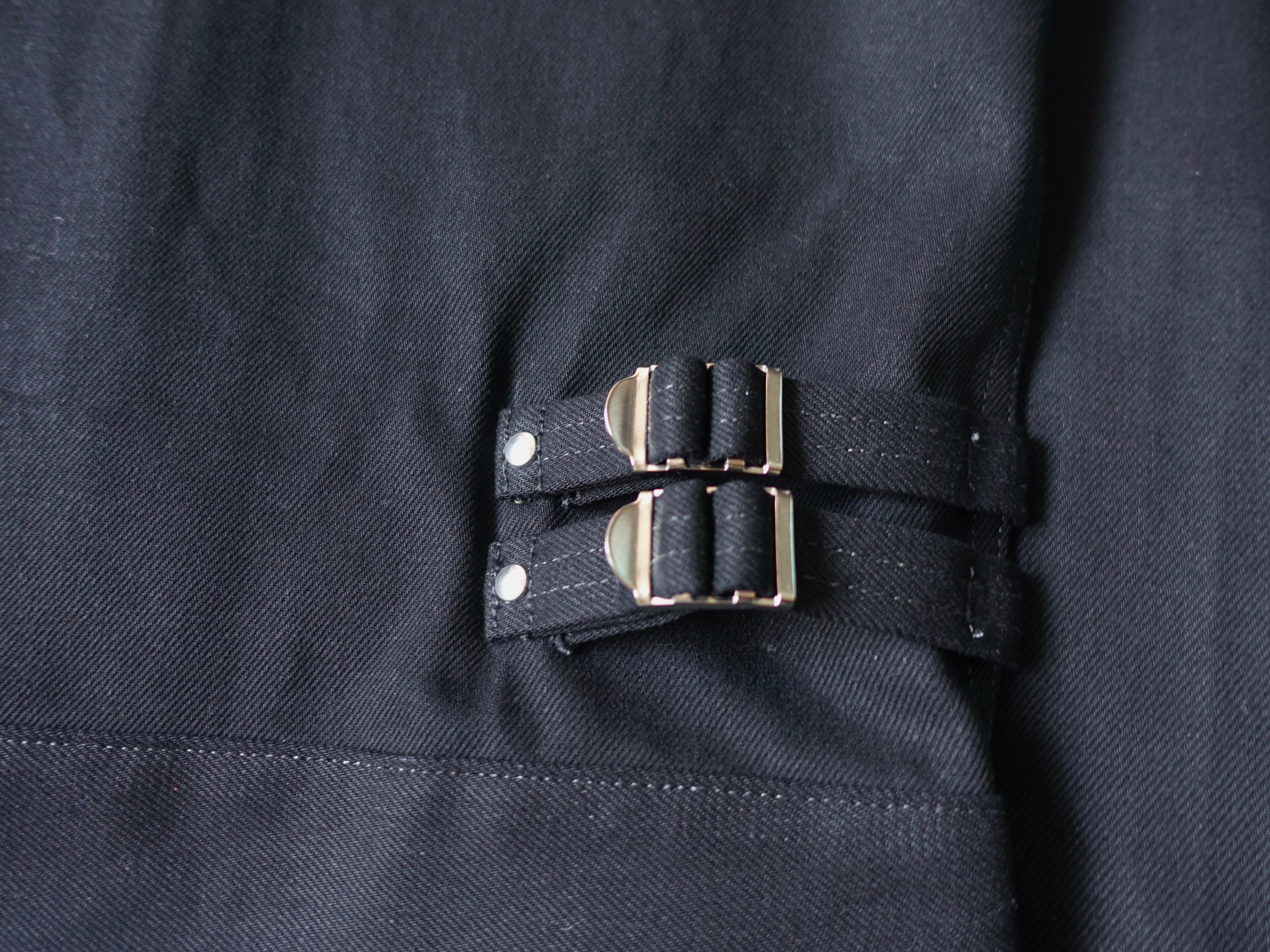 通常背面に1本ずつ付くGIバックルのアジャスターですが、一般的な物より太いタイプにし2連で装着する事でボンテージ感とUKライダースの様な棘のある重厚感を持たせています。