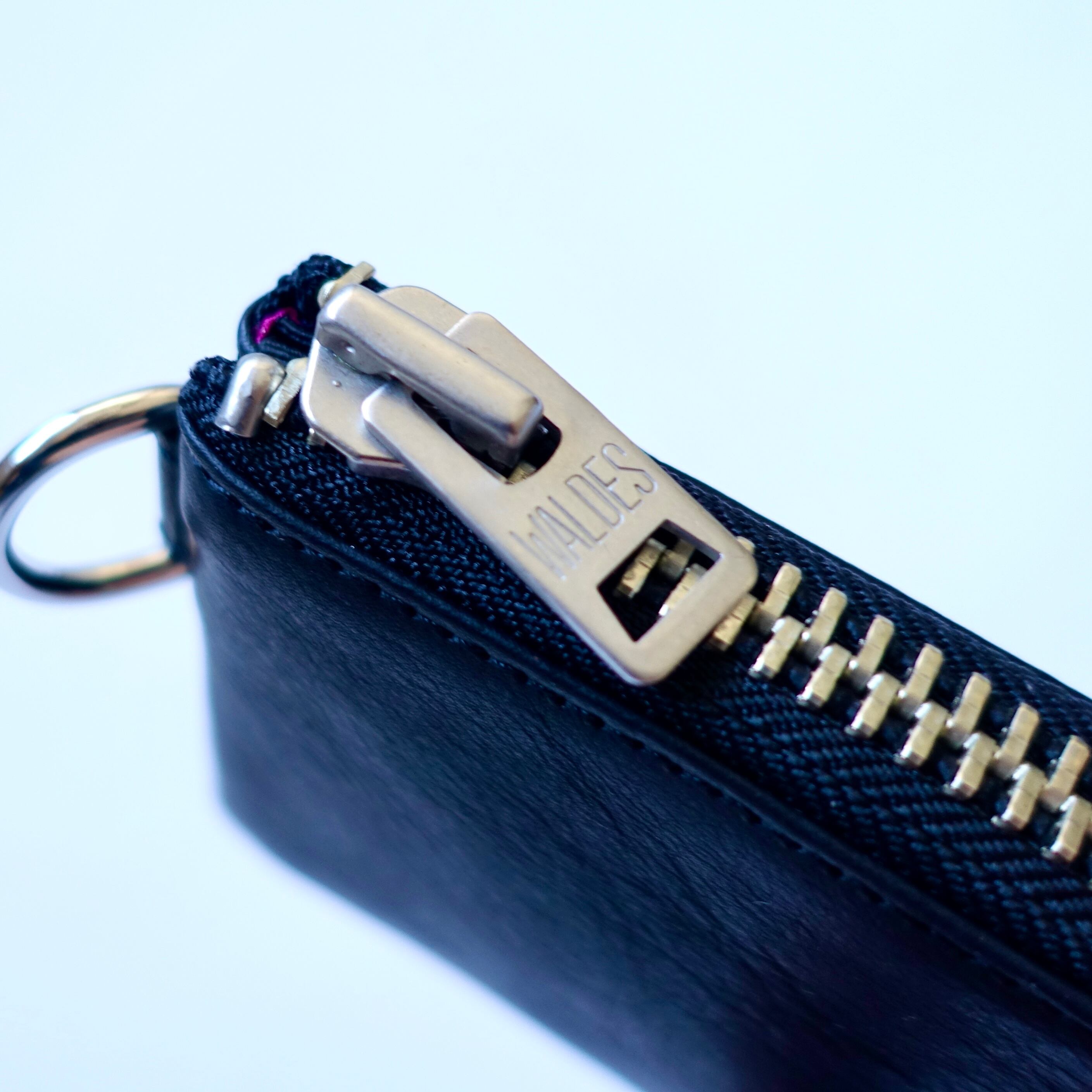 ライダースを思わせる10号ファスナーにDカンを装着し、UKのロッカーズのイメージで作成したコンパクトウォレット。