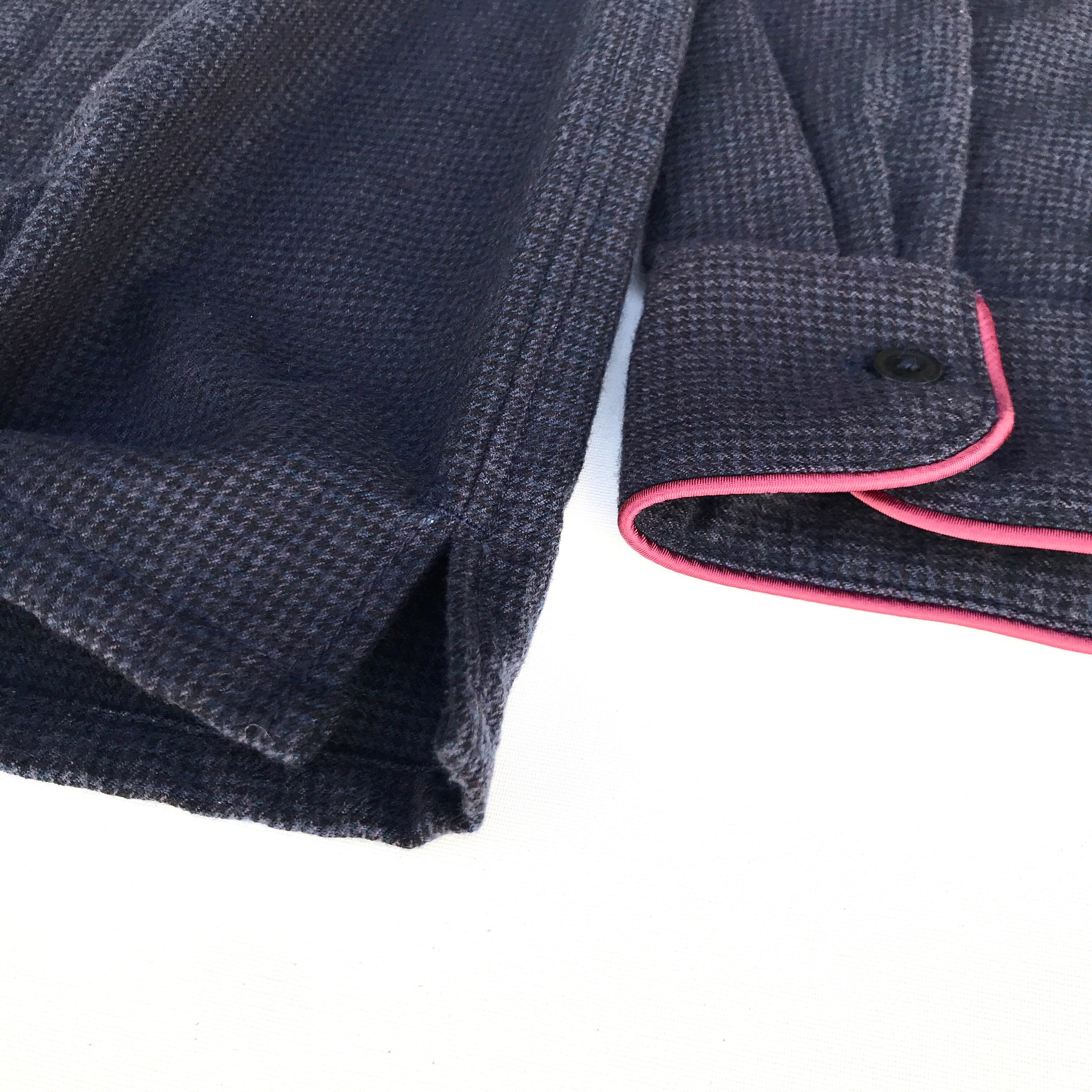 千鳥格子柄のコットンウールに光沢のあるキュプラでパイピングを施す事で、