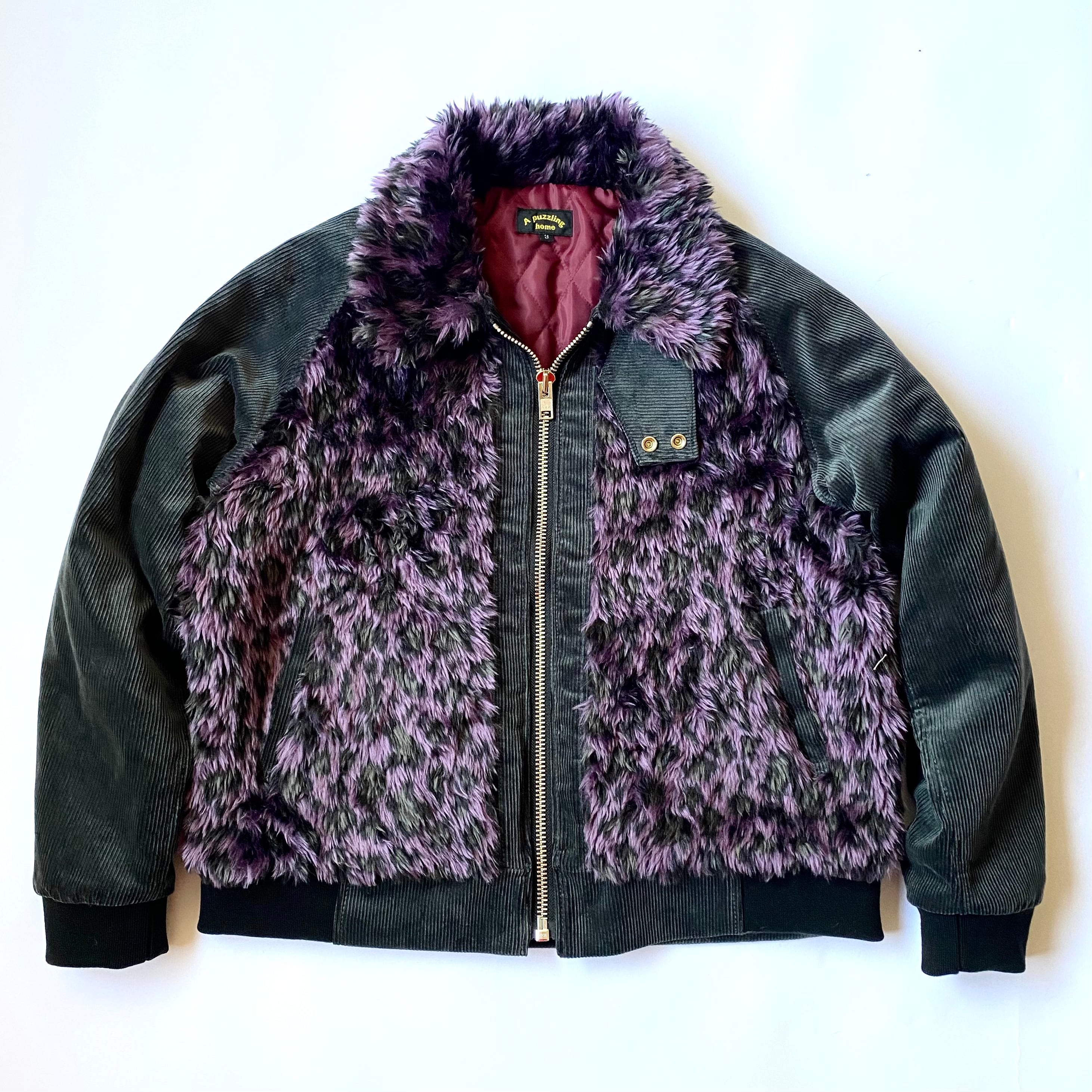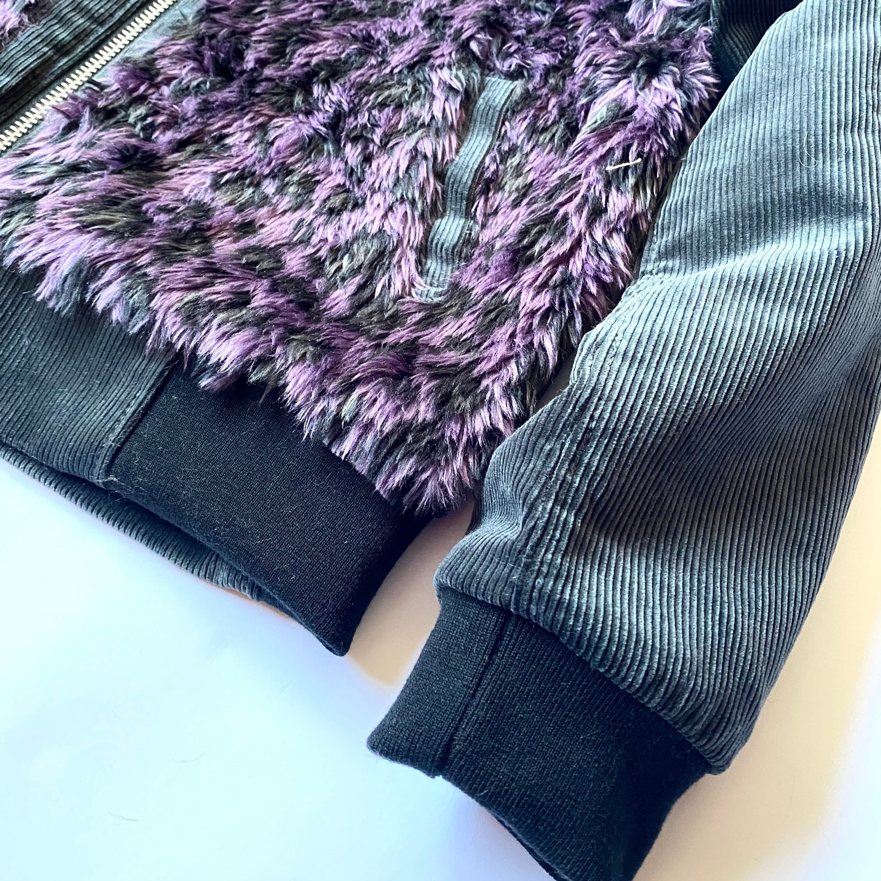 身頃には毛足の長いフェイクファー、袖には別珍の様な上品な表情の太畝コーデュロイ、裏地は色気のあるワインレッドのキルティングを使用。