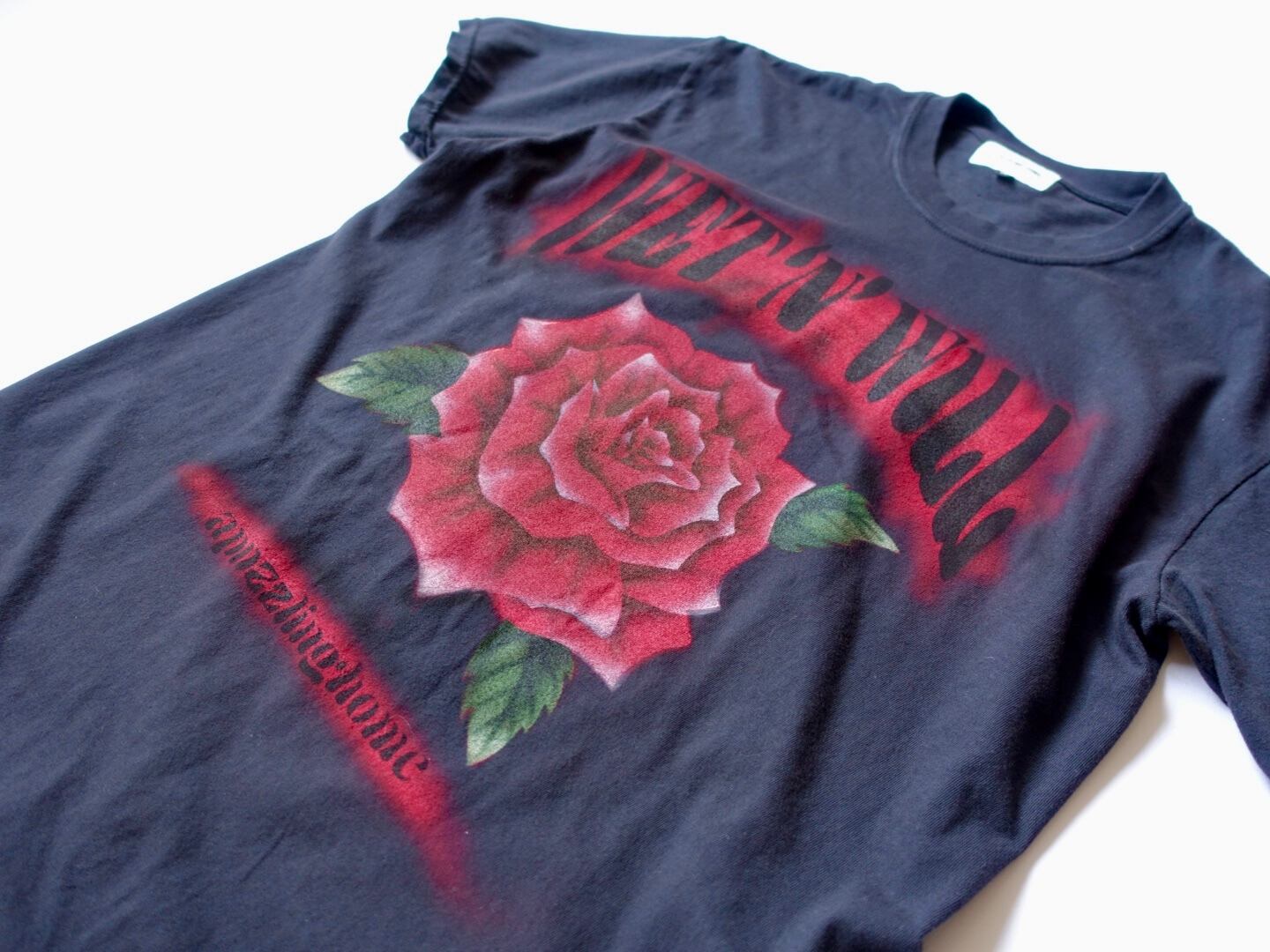 のメッセージに、ロックTで定番のモチーフで、あるバラを組み合わせエアブラシで仕上げたデザイン。