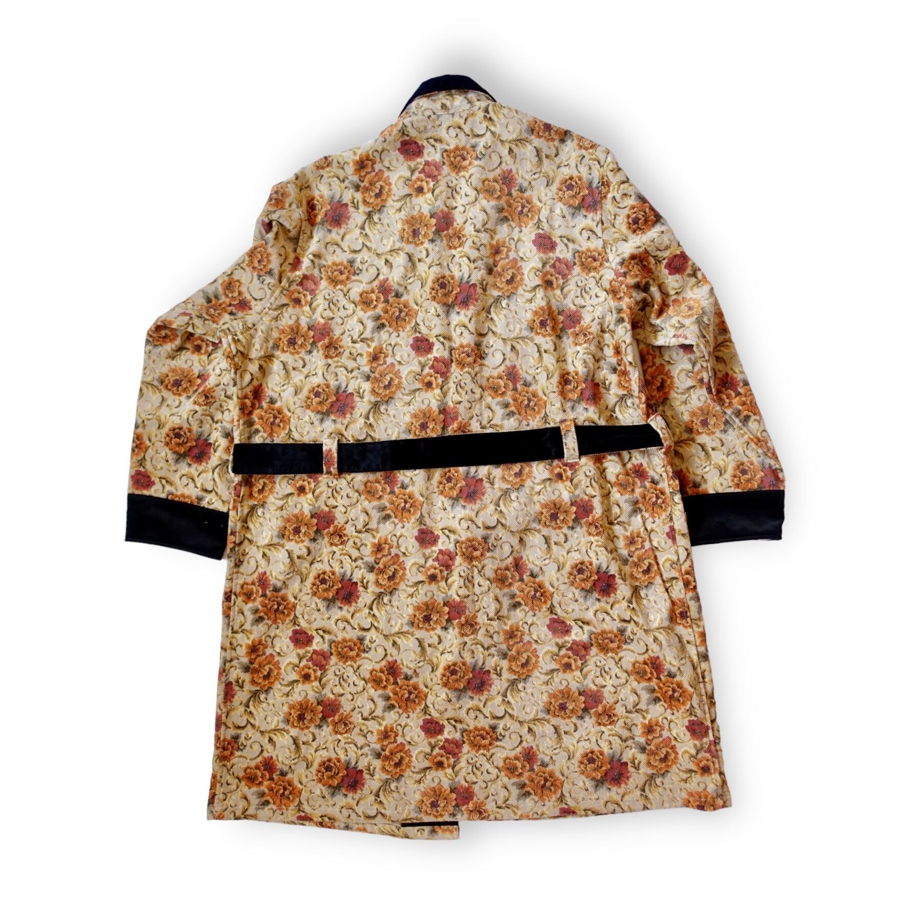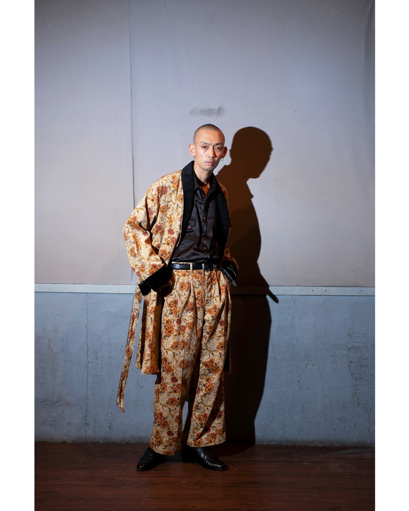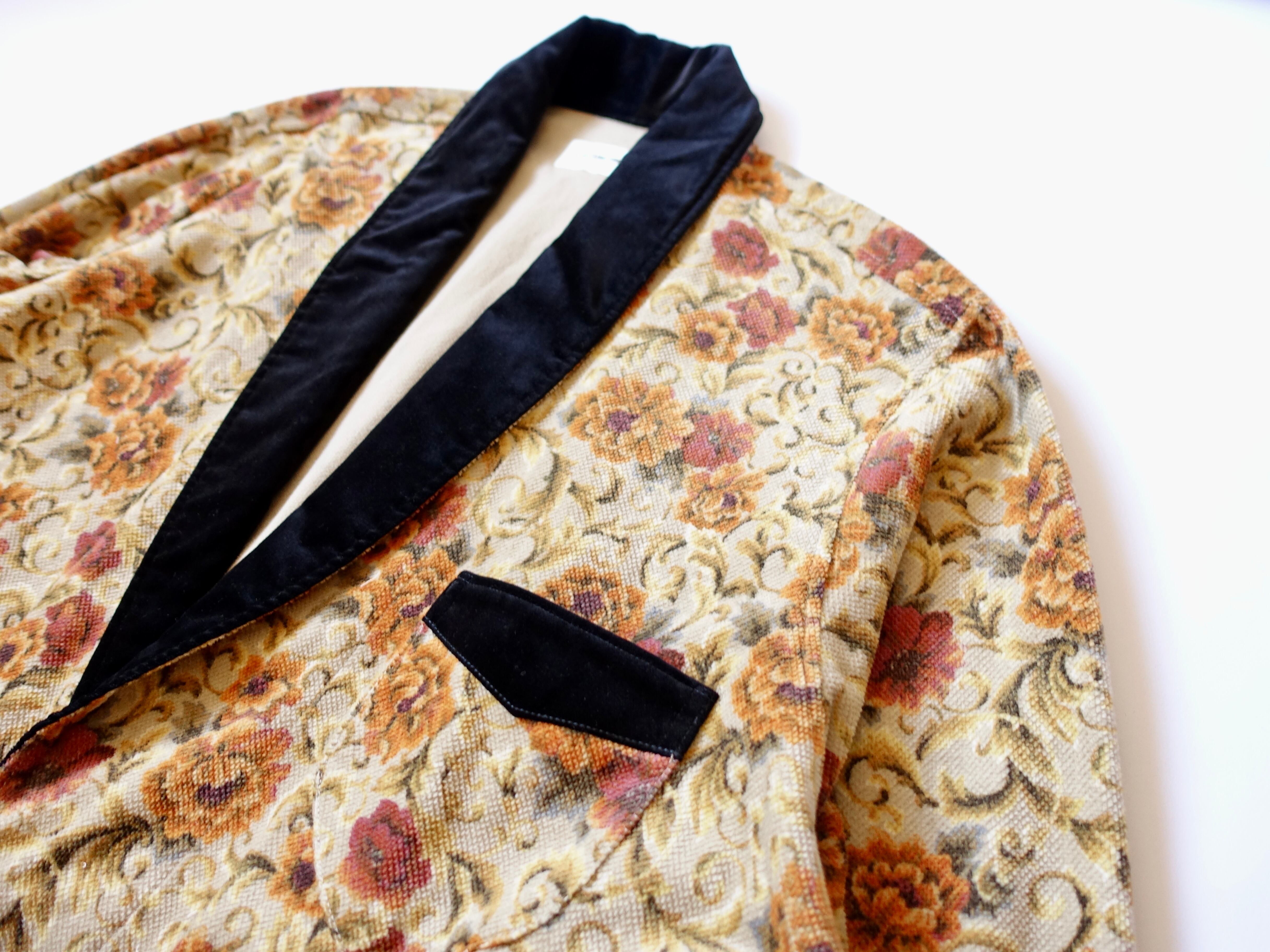 ライスコールと呼ばれる独特な毛並みのコーデュロイに、8色プリントによる薔薇柄の生地で作成したスモーキングガウン
