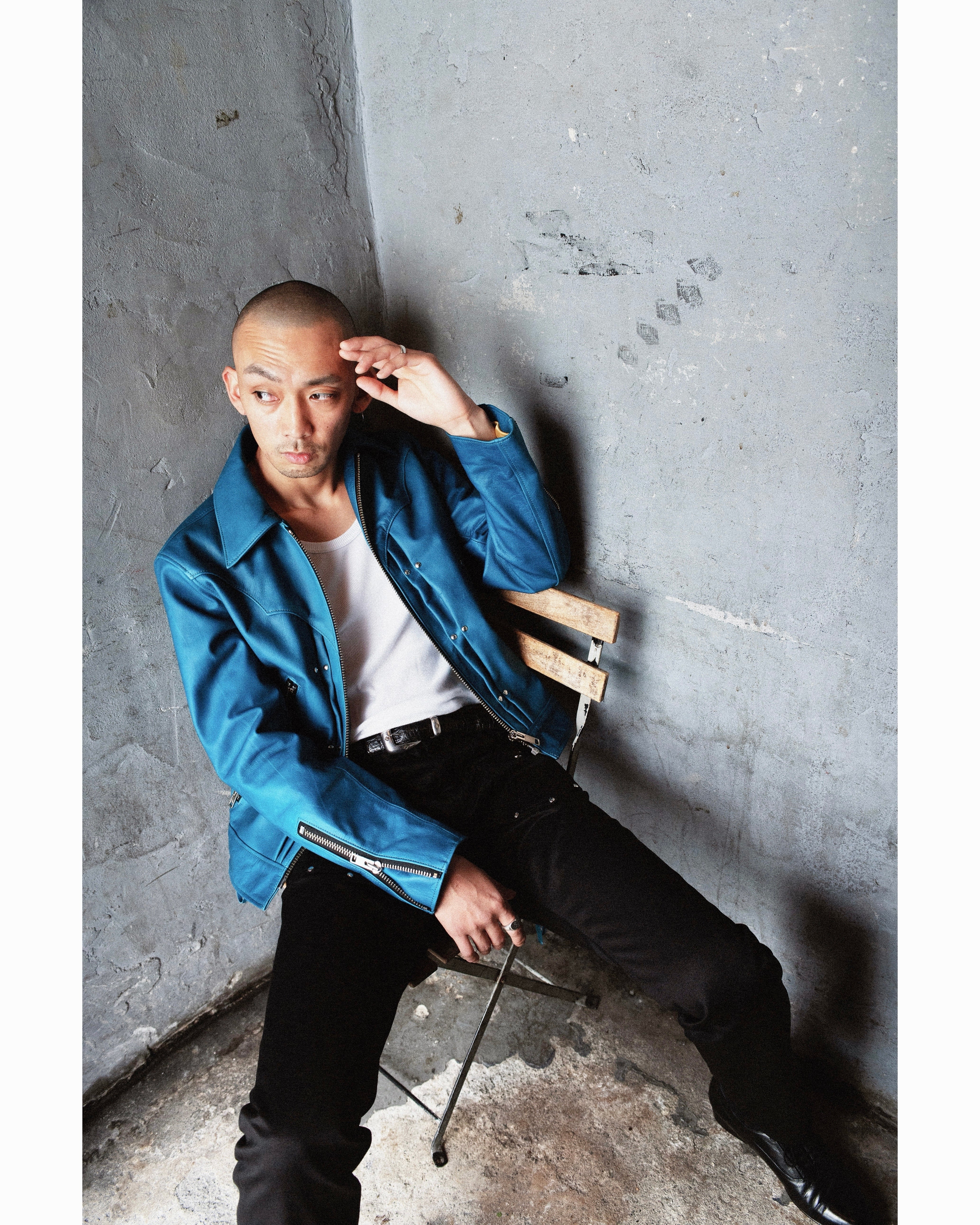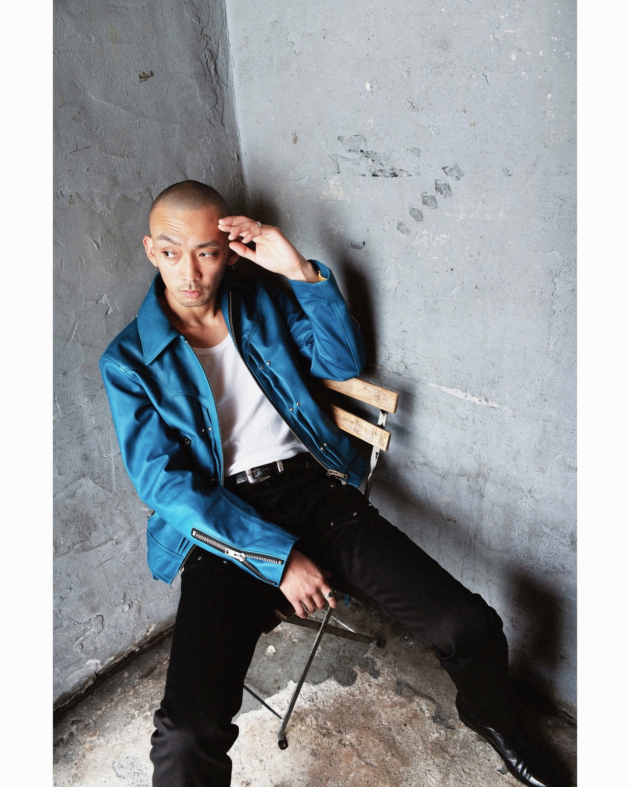 色味や資材はUKライダースの様な雰囲気にし、そこへエッジの効いたウエスタンヨーク、レースアップ、長めのZIP等、70'sクラフトレザーの様なディティールを落とし込んだデザイン。