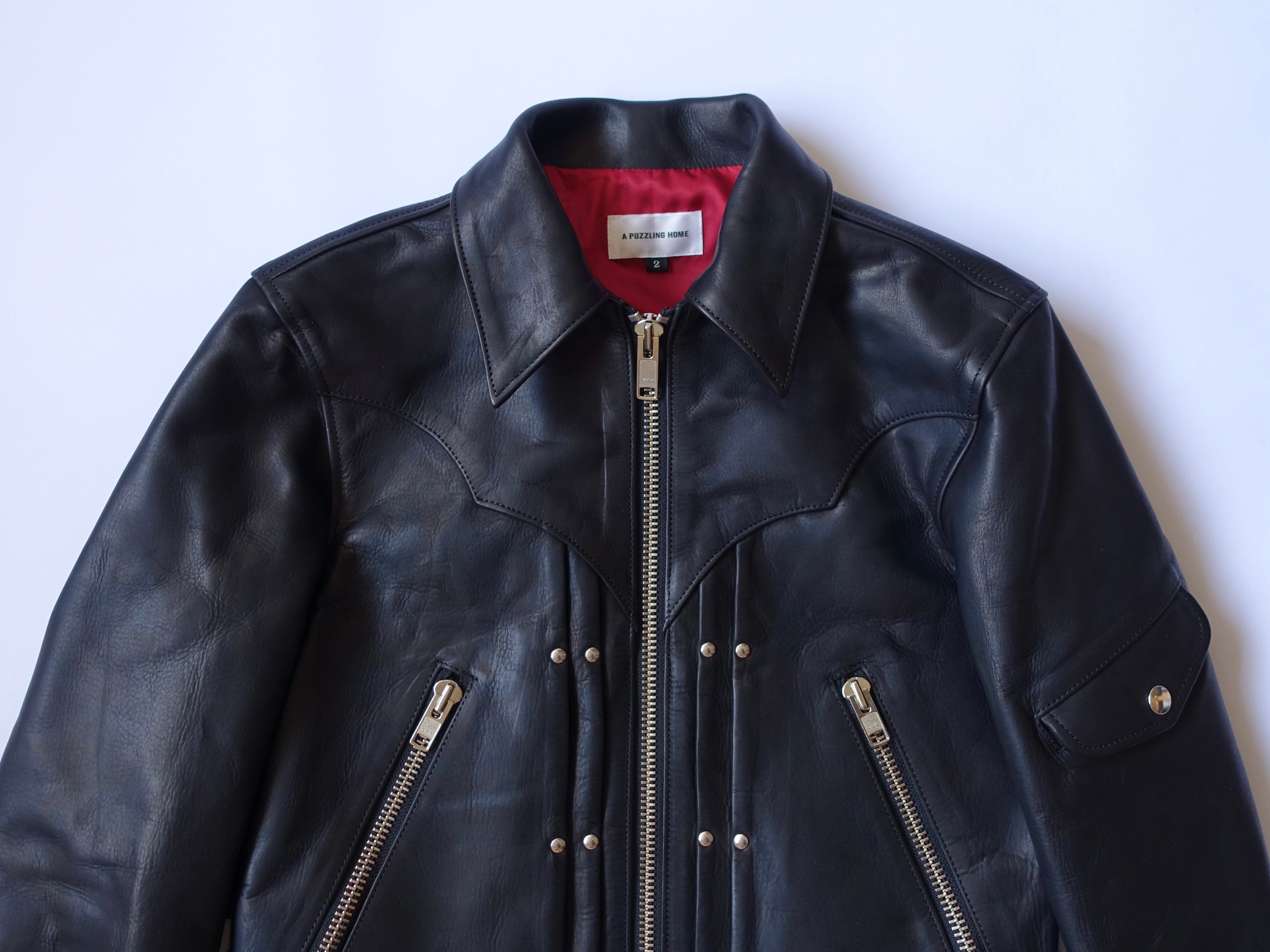 色味や資材はUKライダースの様な雰囲気にし、そこへエッジの効いたウエスタンヨーク、レースアップ、長めのZIP等、70'sクラフトレザーの様なディティールを落とし込んだデザイン。